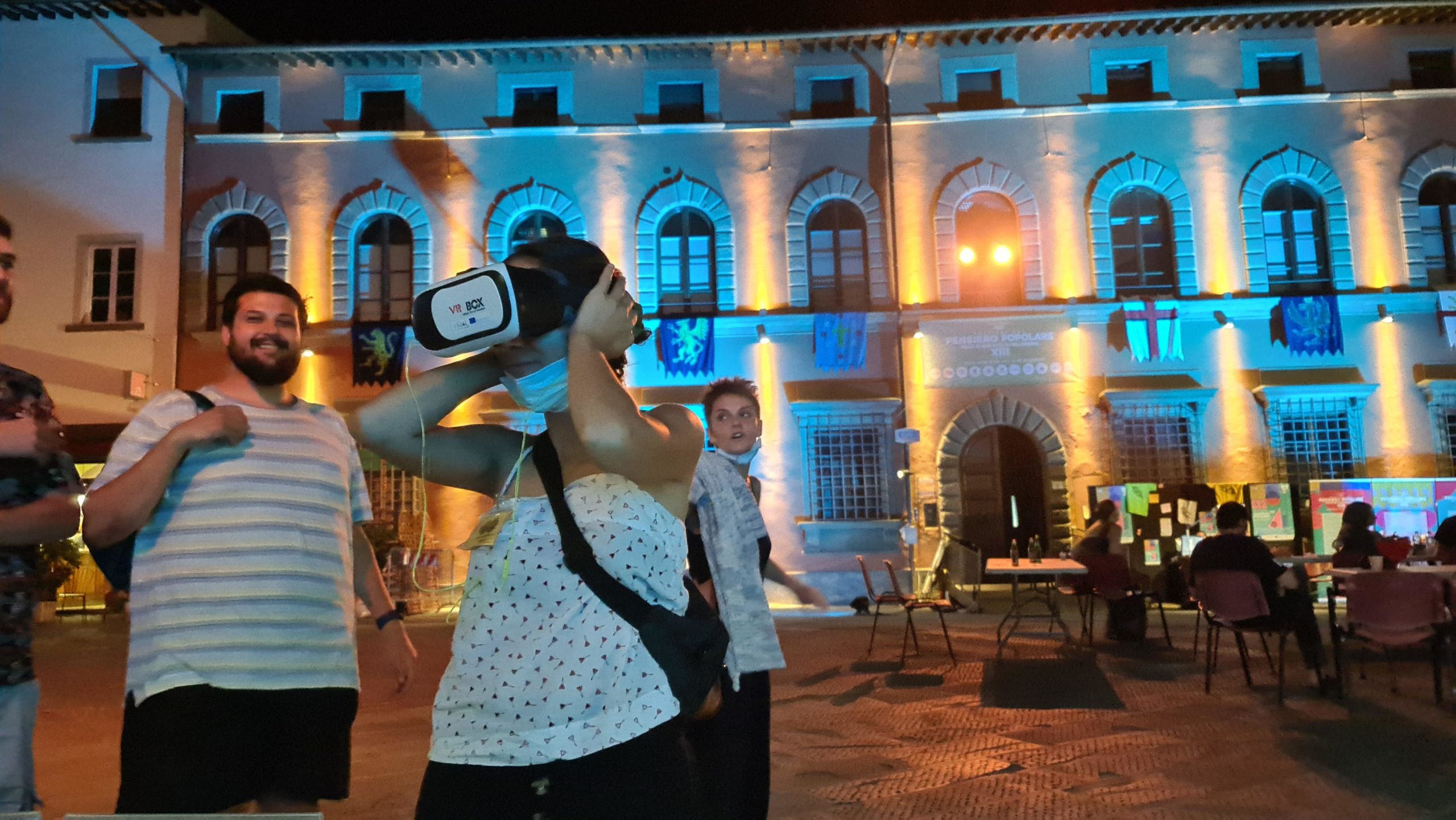 The distribution was carried out in the following way: in the days of August 13th and 14th, during the Festival that took place in Piazza Bonaparte (18:00- 24:00), we arranged a VR booth, promoted by VIRAL, where anyone interested could experiment with the viewing of videos made by various Ambassadors, particularly those from the “Le città nei vicoli” journey of Tra I Binari and Moti Carbonari. During a total of 12 hours, about 30 people grappled with VR sessions, with an average time of 2 minutes per session. The average age of the participants was rather low, the girls and boys of the Scioa neighborhood between the ages of 6 and 12 were the more numerous to participate and really appreciated the product, with session up to 6 minutes. The little ones were indeed thrilled with their first experience using a VR visor. The young adults of San Miniato and surroundings, which had come to the Festival to participate and attend the theater performances, were striked by the possibility of visiting their cities through this tool, and appreciated the journey which evoked the sensation of being in two different places in time and space, at the same time.